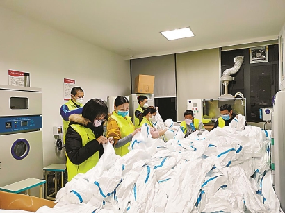 走廊里疊衣服的大姐說:“網(wǎng)上的視頻里,醫(yī)生戴著口罩,穿著防護(hù)服在病房走進(jìn)走出,只能看到一雙眼睛,看到那眼神我就想哭。”說著,她低頭仔細(xì)把衣服折好,“前線那么辛苦,我們就多做些力所能及的。”